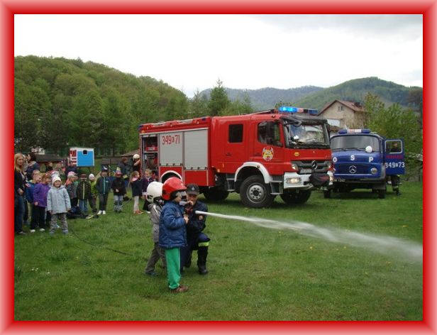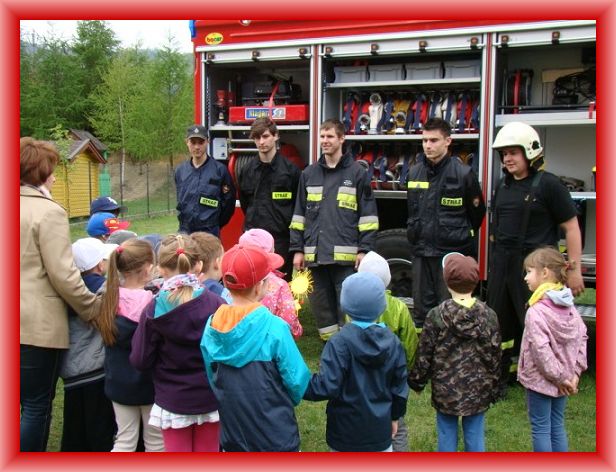 W poniedziałek 04.05 w Dniu Strażaka do przedszkola zawitali strażacy z jednostki OSP Rytro. Zapoznali dzieci z ich pracą, zaprezentowali sprzęt jakim posługują się podczas akcji, oraz zademonstrowali sposoby udzielania pierwszej pomocy rannym. Dzieci mogły wejść do samochodu technicznego i gaśniczego. Na koniec strażacy przygotowali nam największą atrakcję: każde dziecko mogło samodzielnie polać wodą z węża strażackiego w prawdziwym hełmie. Każda grupa wręczyła strażakom własnoręcznie wykonane upominki. Wizyta strażaków zrobiła na dzieciach ogromne wrażenie.